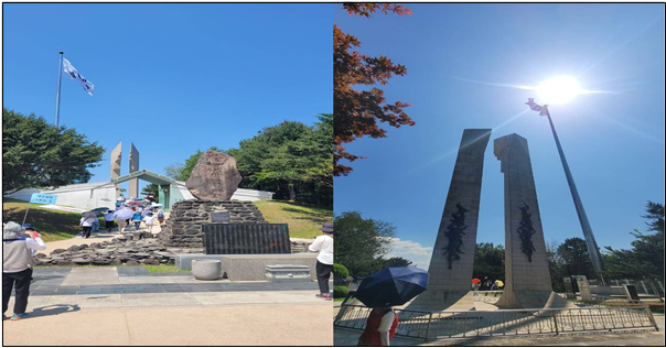 태극기 길을 따라 위령비에 이르면, 전투 전사자들의 이름이 가득 적힌 비석이 보이고, 그 옆으로는 멈춰 선 6.25 시계탑이 자리하고 있습니다. 시계는 전쟁 승리 일자 등을 상징적으로 표현하고 있는데, 전사자들의 위령비와 함께 전쟁의 아픔이 더욱 마음에 새겨지는 듯했습니다. 다시는 남북한 간에 이처럼 참담한 전쟁이 일어나지 않기를 바랍니다.