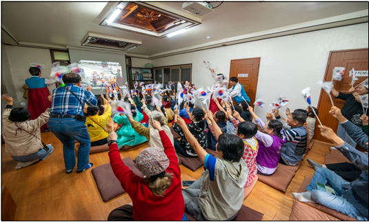 장기자랑이 시작되자 태극기를 흔들며 노래 가사를 따라 부릅니다.
