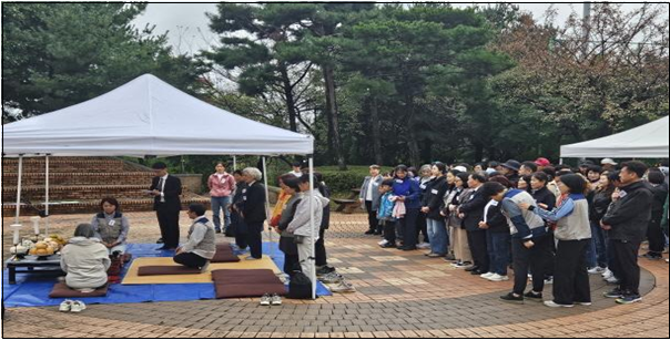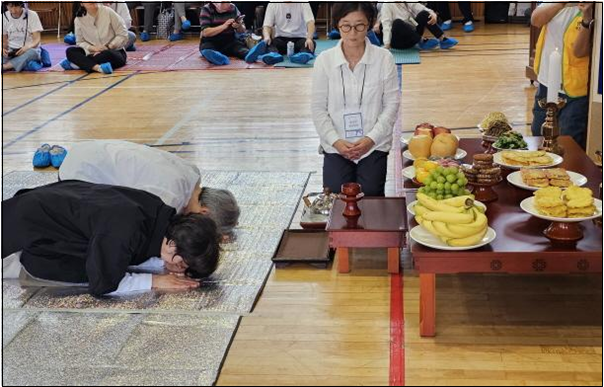 이어서 조상님들께 감사한 마음을 올리는 합동차례를 시작합니다. 합동차례는 수영 지역에서 맡았습니다. 여는 모임을 하기 전부터 병풍을 치고 여러 종류의 전과 나물, 과일 등으로 정성껏 차례상을 준비해 두었습니다. 윗동네 아랫동네 분들은 차례로 조상님께 잔을 올리고 절을 하며 정성스런 마음으로 합동차례를 올렸습니다. 어서 빨리 평화 통일이 되어 고향에 계신 조상님 산소에 찾아뵐 수 있길 간절히 기원합니다.