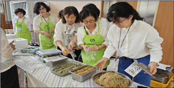 윗동네분들이 준비해 온 음식이 눈에 들어옵니다. 당면없이 시래기와 찹쌀, 선지로 채워넣은 북한식 순대와 북한에서는 두부밥으로 부르는 유부초밥, 북어채무침, 고춧가루를 넣은 북한식 고사리볶음, 언감자를 갈아서 속을 야채로 넣어 담백한 언감자떡도 있습니다. 맛을 보여주는데 담백하고 맛납니다. 윗동네 분들은 담백한 음식을 좋아하는 것 같습니다.