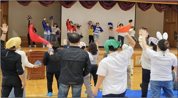 다섯 무대가 끝날 즈음, 어린이 한 명이 즉석 장기자랑을 신청합니다. 이전보다 더 큰 박수소리가 체육관을 울립니다. 로제의 ‘아파트’를 부릅니다. “아파트, 아파트” 하며 댄스 손동작을 참여자 모두가 따라합니다. 사회자는 역대급 무대였다며 심사위원들의 심사가 어렵겠다고 걱정합니다. 그래도 인기상 한 팀과 참가상 네 팀이 탄생합니다. 다음을 기약하며 마무리했습니다.