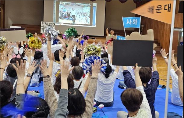 금정, 수영, 해운대, 동래, 남울산, 중울산, 사하지역은 머릿수건, 머리띠 반짝이 옷 등 독특한 복장과 도구를 활용해 사회자의 호명에 따라 지역을 소개합니다. 파도타기 같은 지역 소개에 이어서 어울림 한마당을 시작합니다.