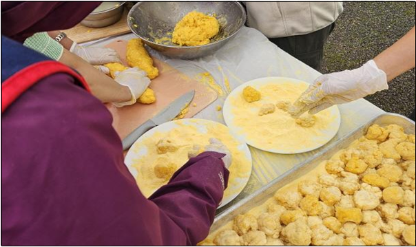 같이 머리를 맞대고 모여서 옥수수 가루로 펑펑이떡을 만들어 보기도 합니다. 준비한 먹거리만 열 가지가 넘어서 풍성하게 배부른 점심시간이 되었습니다.